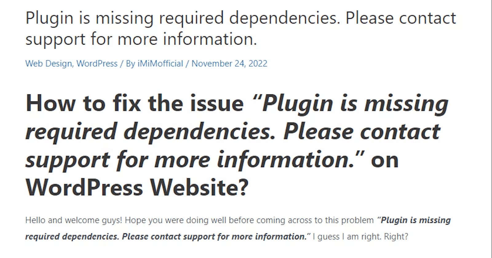 Anyway, then I search for the exact problem with a quotation like this “Plugin is missing required dependencies. Please contact support for more information.” expecting that at least someone will ask it or provide a solution to it. But what I found is shown below –